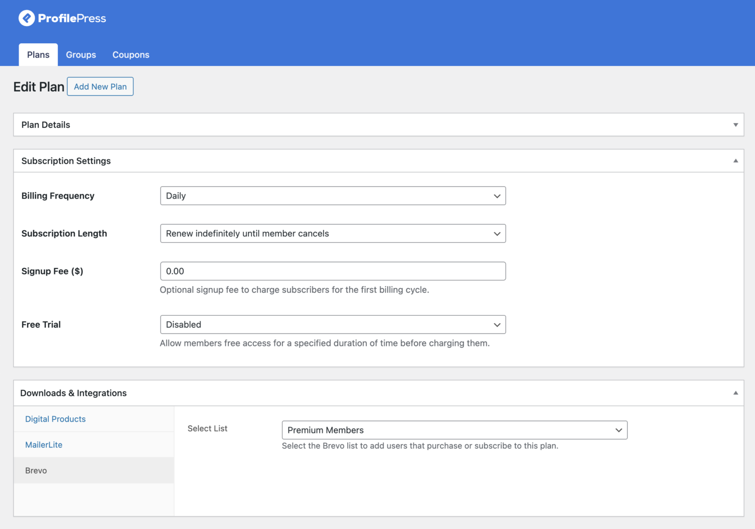 Also, when members subscribe to a plan, they will be added to the Brevo list you have configured for that plan. And if their subscription expires, they will be removed from the list.