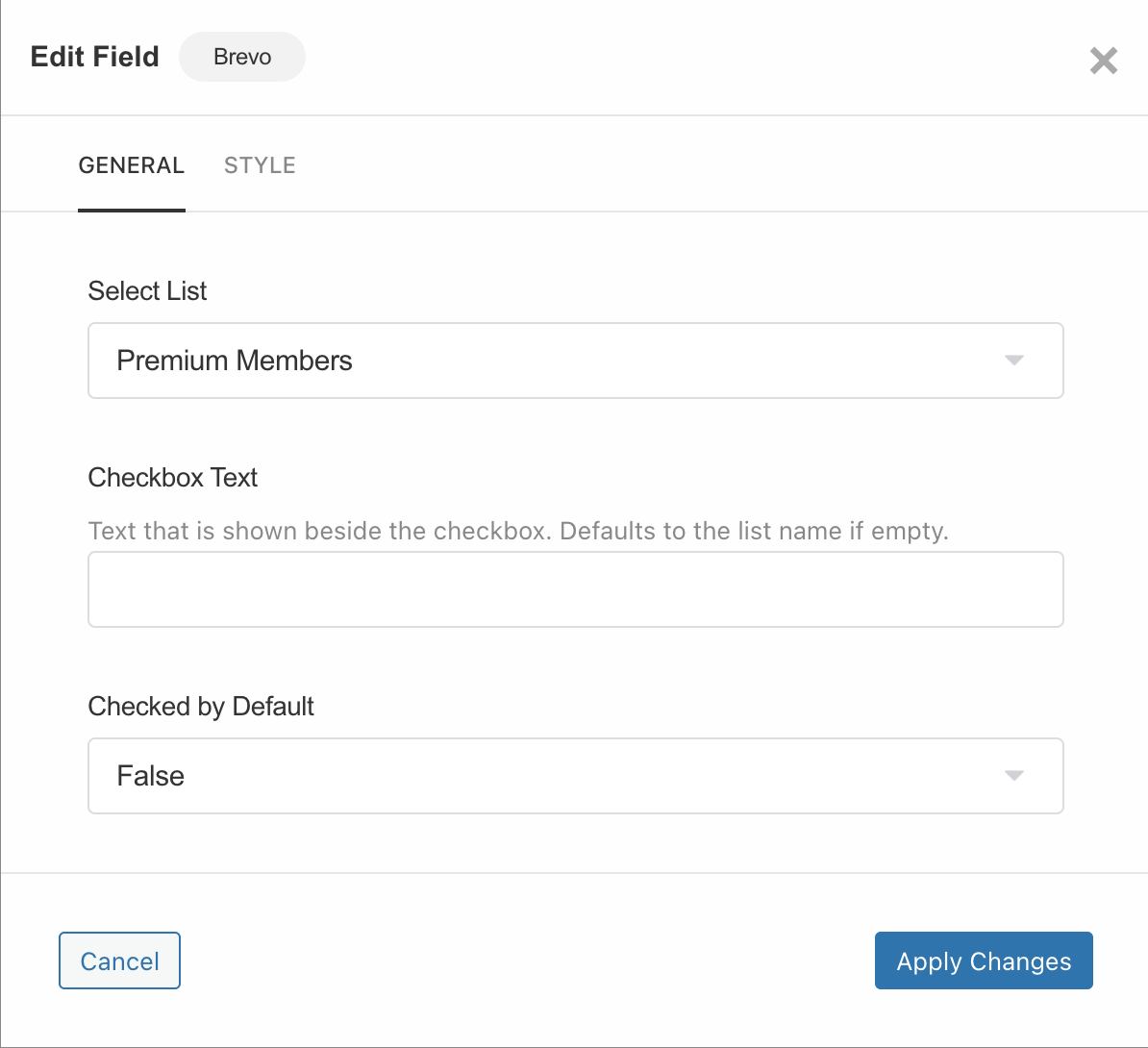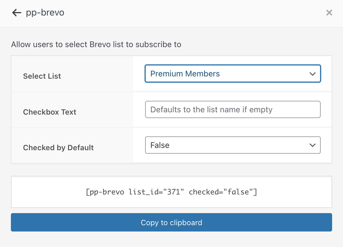 Note: Each list must have been created on the settings page. See Setting Up Brevo Addon