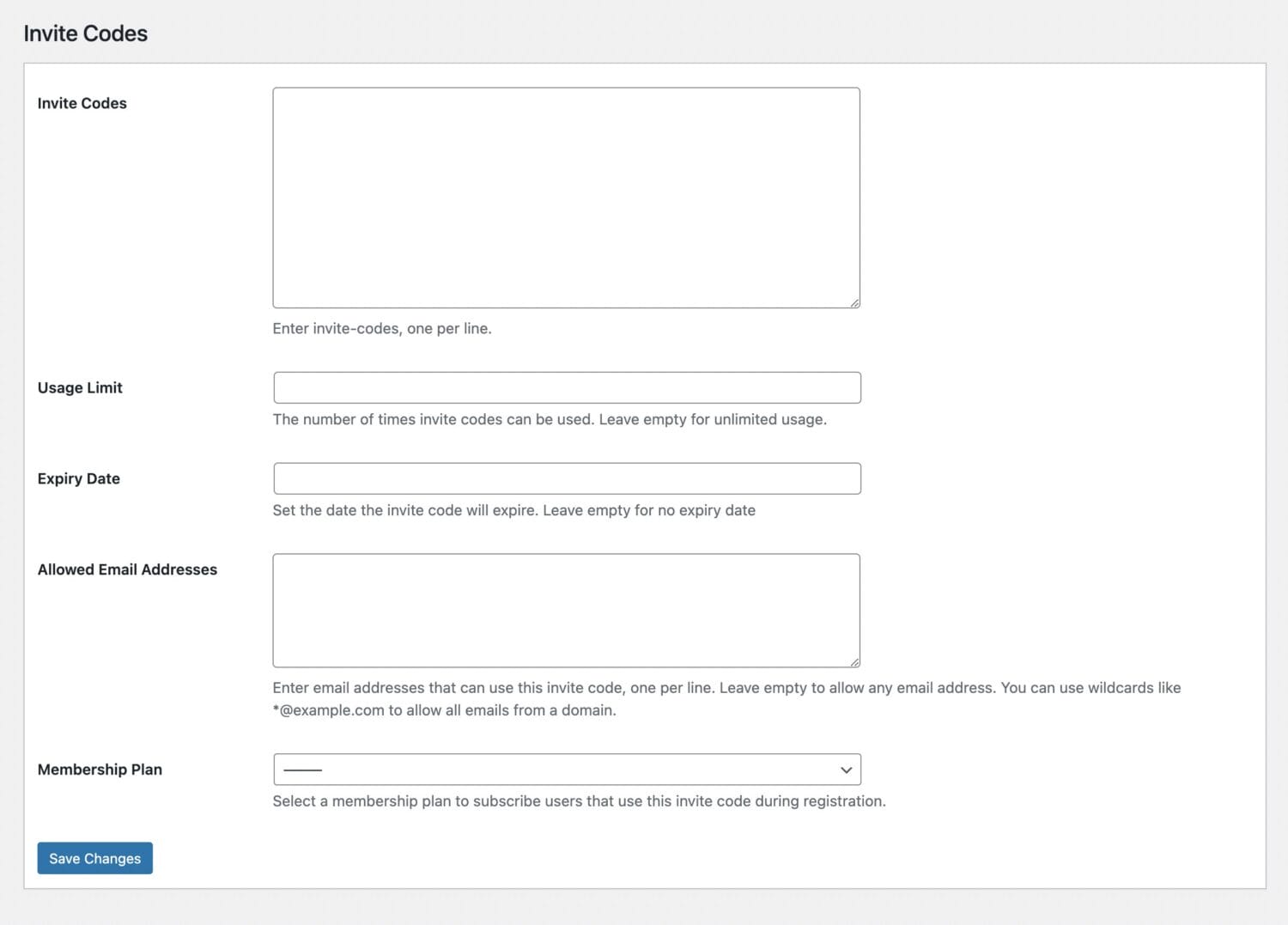 Submit the form by clicking the Save Changes button, and you will be redirected to a page where you can view all your current invitation codes.