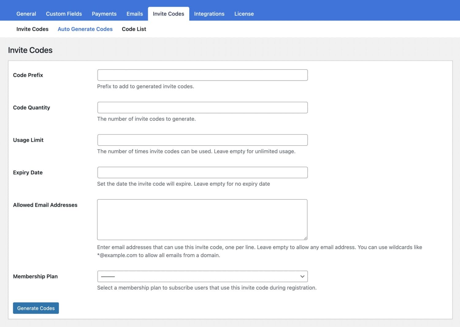 If you want to bulk generate invite codes automatically, the code generator feature is accessible by clicking the “Auto-Generate Codes” submenu.