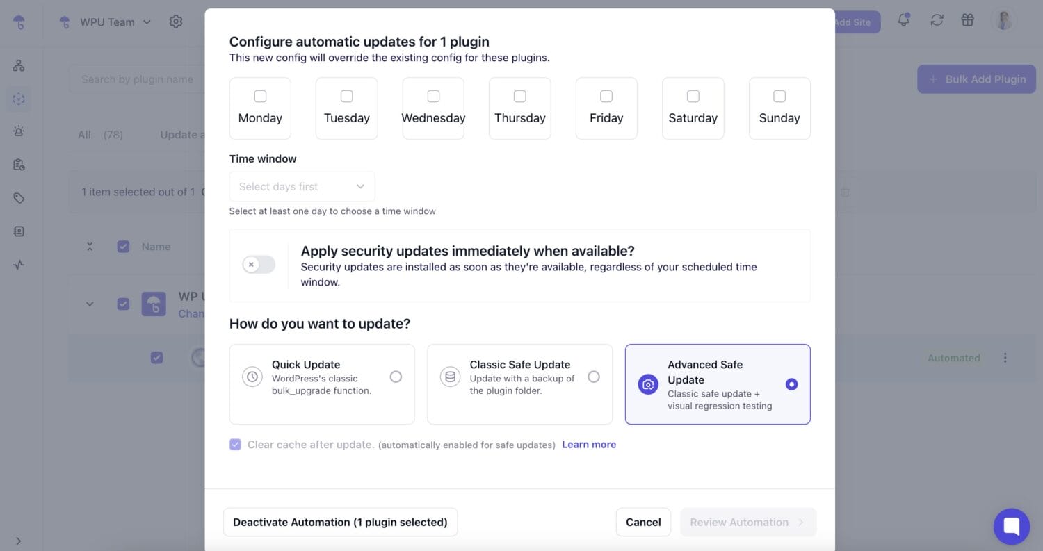 - Advanced Safe Update – This is the safest option because it adds visual regression testing (before/after screenshots + comparison), so you can catch potential layout/design issues if it comes to that. Gives the option for manual review or automatic rollback.