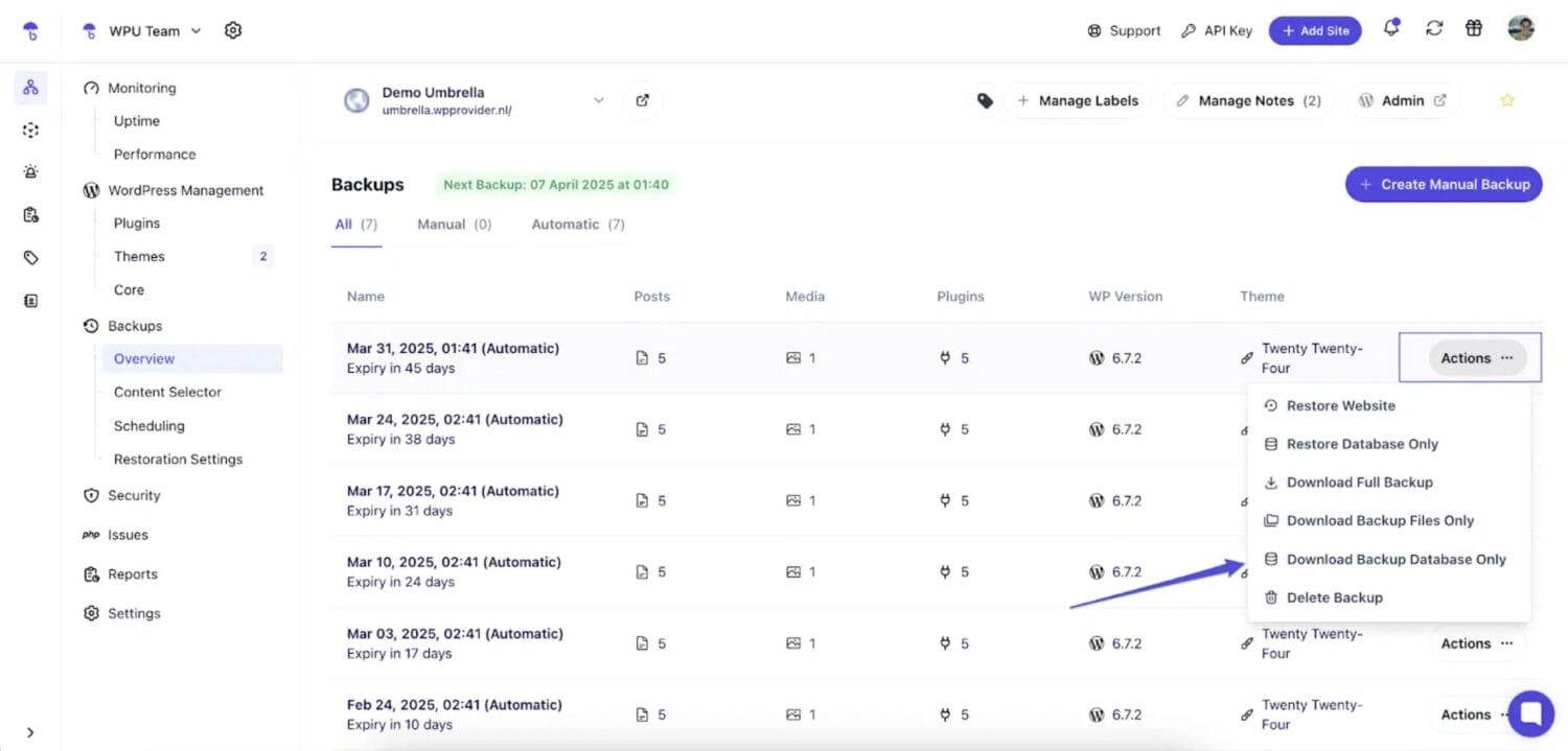 WP Umbrella is a great choice for agencies that aim to follow the 3-2-1 backup rule: 3 copies of your site, on 2 different storage types, and 1 off-site backup.