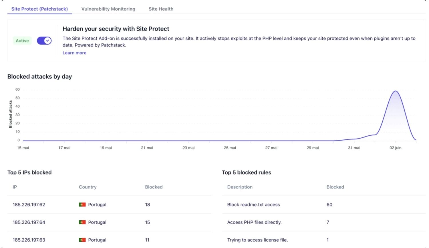 - Vulnerability monitoring – lets you see if any plugins, themes, or the WordPress core have known vulnerabilities, what their severity level, update status, and any recommended next steps. This lets you react before attackers can exploit these issues.