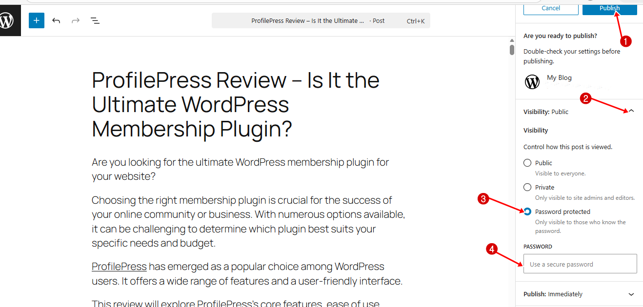 As you have seen, WordPress includes a built-in password protection feature that works well for protecting individual pages or posts. However, if you need more flexibility, such as restricting content based on login status, user roles, or membership plans, a plugin like ProfilePress offers more advanced options.