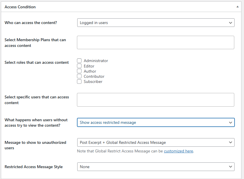 If you choose Show Access Restricted Message, you can enter the message that unauthorized users will see. For example, you might display a message like “This content is available to members only. Log in or subscribe to access it.” You can also choose the Restricted Access Message Style.