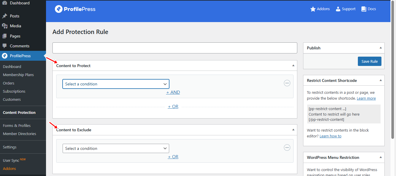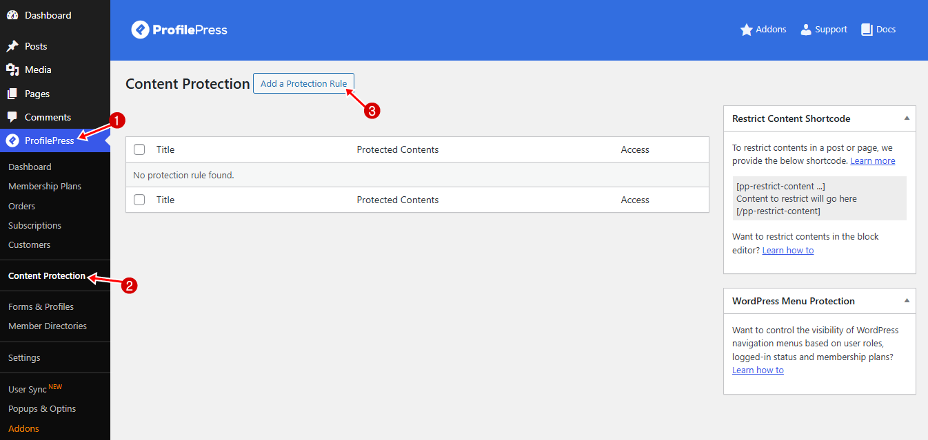 After activation, navigate to ProfilePress > Content Protection in your WordPress dashboard, then click Add a Protection Rule to create a new content restriction rule.